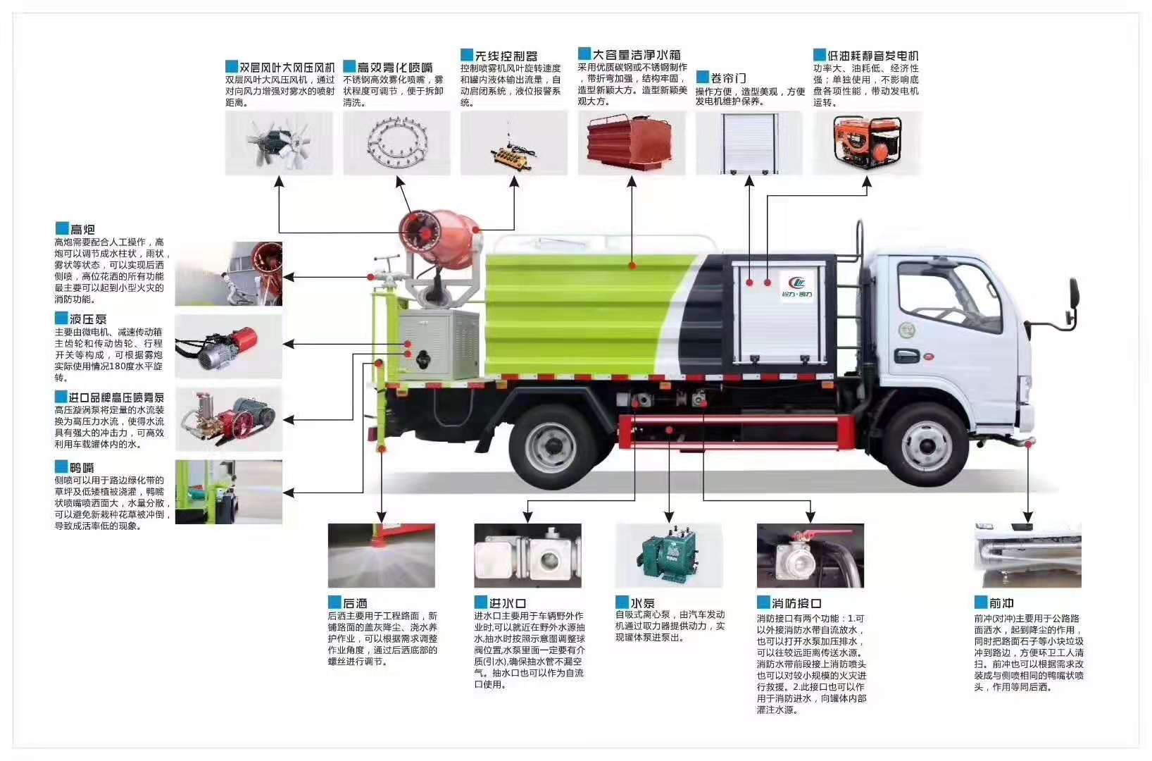 還可定制液晶屏控制在駕駛室操作。5方罐配40-50型霧炮;8方罐配40-70型霧炮;10方罐配50-80型霧炮;12方以上配60-120型霧炮。一般情況下一罐液體噴霧2--4小時(shí),噴霧時(shí)間跟炮型和油門有關(guān)。