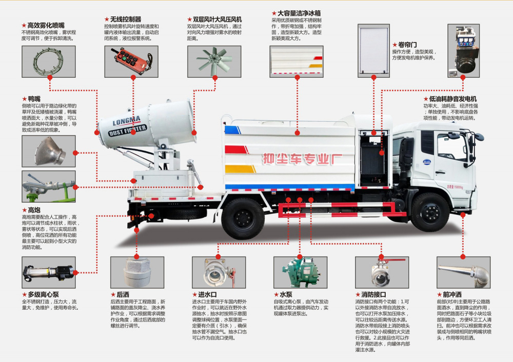 噴霧抑塵車隨車裝配大功率柴油機(jī)、三相交流同步發(fā)電機(jī)、三相異步電動(dòng)機(jī)、三缸活塞泵,并安裝風(fēng)機(jī)風(fēng)炮,為農(nóng)藥噴灑提供專一動(dòng)力來源和專用設(shè)備。灑水泵可抽水排水,安裝濾網(wǎng),帶消防接口,可通過消防栓進(jìn)水,帶自流閥,隨車選裝20米噴藥綠化卷盤